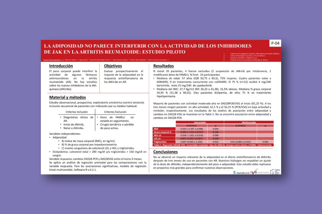 La adiposidad no parece interferir con la actividad de los inhibidores de JAK en la artritis reumatoide: Estudio piloto