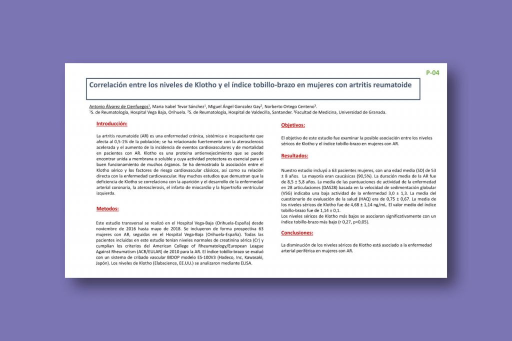 Correlación entre los niveles de Klotho y el índice tobillo-brazo en mujeres con artritis reumatoide