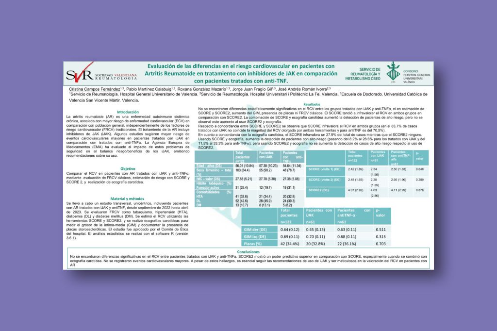 Evaluación de las diferencias en el riesgo cardiovascular en pacientes con artritis reumatoide en tratamiento con inhibidores de JAK en comparación con pacientes tratados con anti-TNF